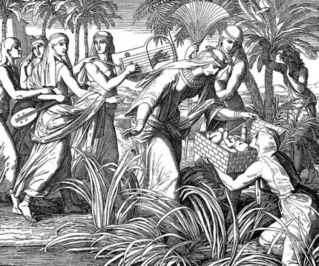 모세는 어머니 요게벳과 누나 미리암의 지혜로 겨우 살아남았고 아기를 더 숨겨둘 수 없게 되자 갈대상자 속에 아기를 뉘어 강가 갈대 숲 속에 놓아두었는데, 마침 바로의 딸이 강에 목욕하러 왔다 아기를 보자 마음이 움직여 아기를 양자로 삼았고, 강에서 건진 아이라는 뜻으로 모세라고 이름을 지었습니다.