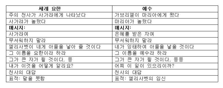 Brown(“The Birth of the Messiah”)은 세례요한(누가복음1:5-25)과 예수(누가복음 1:26-45,56)에 관한 수태고지를 다음과 같이 비교하고 있습니다. [p. 297]